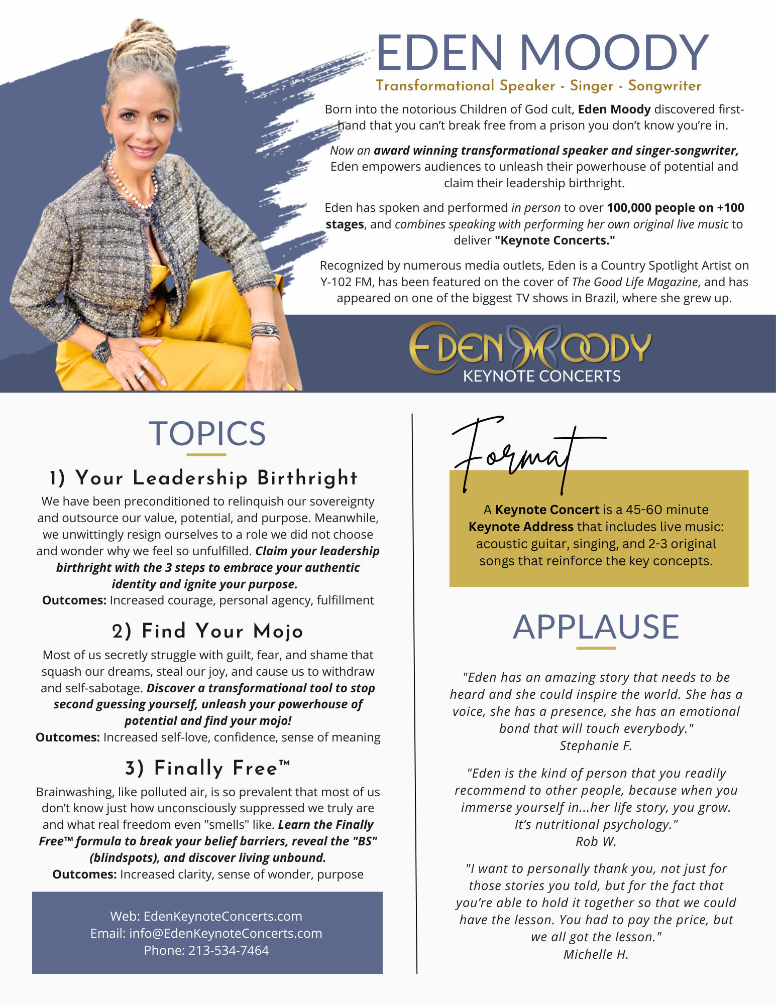 Born into the notorious Children of God cult, Eden Moody discovered first-hand that you can’t break free from a prison you don’t know you’re in.Now an award winning transformational speaker and singer-songwriter, Eden empowers audiences to unleash their powerhouse of potential and claim their leadership birthright.Eden combines speaking with performing her own original live music to deliver "Keynote Concerts".With an acoustic guitar, a euphonious voice, and captivating stage presence, Eden engages her audience in a dynamic transformational journey weaving fascinating stories, uplifting original songs, and powerful takeaways that not only inspire and entertain, but that also convey deep insights and leave a lasting impact.This is not your average keynote. Eden’s “Keynote Concert” is a remarkable “song-versation” experience that will stand out as the highlight of any event for years to come!Recognized by numerous media outlets, Eden is a Country Spotlight Artist on Y-102 FM, has been featured on the cover of The Good Life Magazine, and has appeared on one of the biggest TV shows in Brazil, where she grew up.Eden has spoken and performed in person to over 100,000 people on +100 stages and has touched audiences big and small, from all walks of life at fundraising events, church conferences, spiritual retreats, and educational establishments. Indeed, Eden has even addressed the Brazilian Senate.Eden has also independently released two fan-funded albums and leads her own annual Songversation Summit event—a virtual Keynote Concert showcase of musical keynote speakers—for personal development and live music lovers around the world.